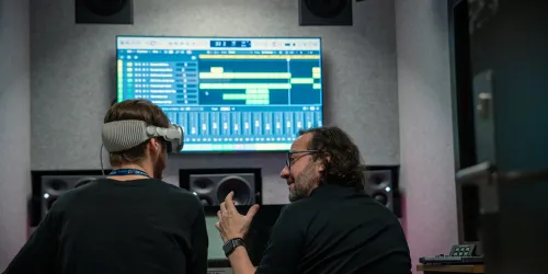 dennis bajer audio immersive engineer wearing headphones at bauhaus studio